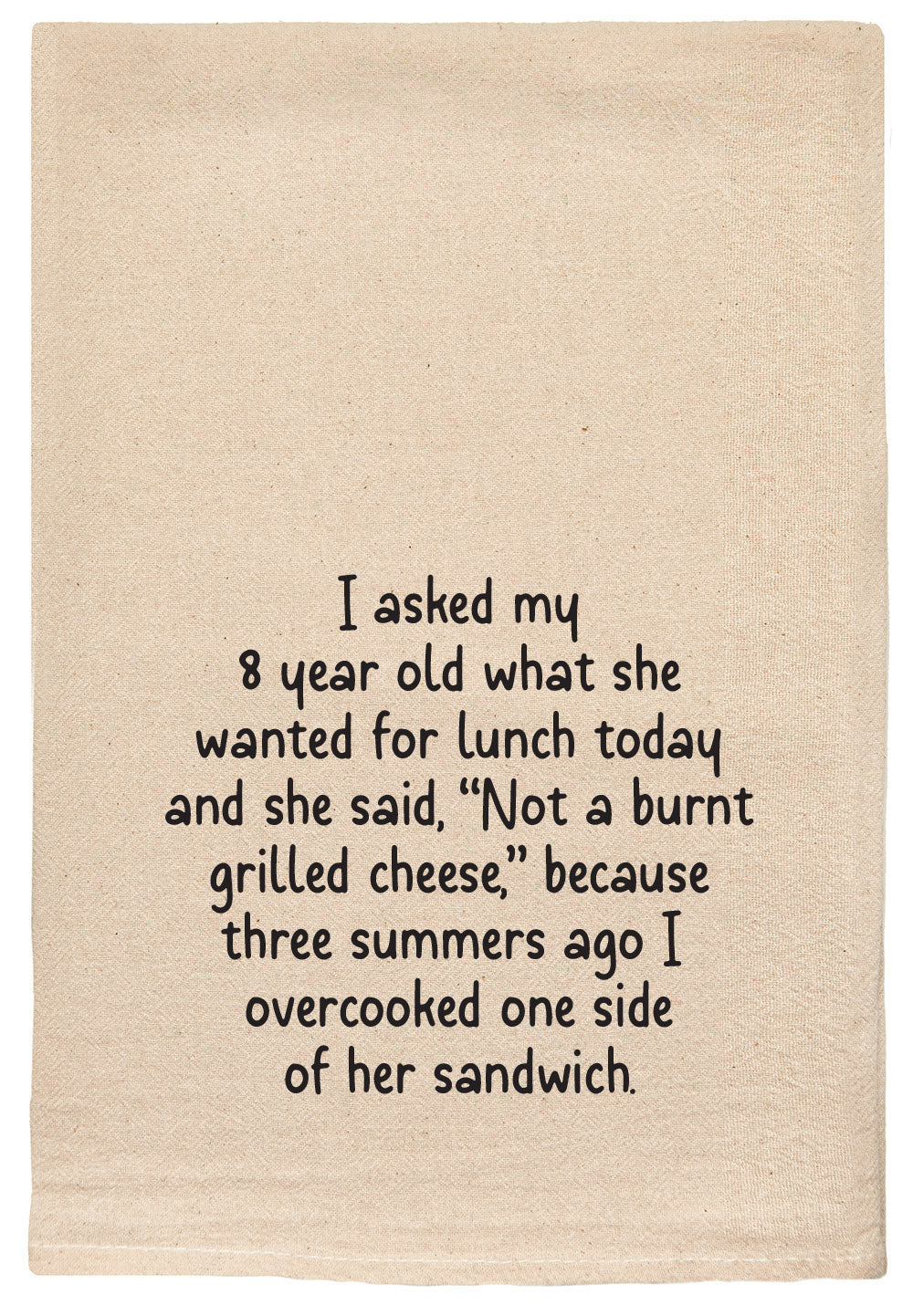 I asked my 8 year old what she wanted for lunch today and she said, "Not a burnt grilled cheese." because three summers ago I overcooked one side of her sandwich natural kitchen tea towel