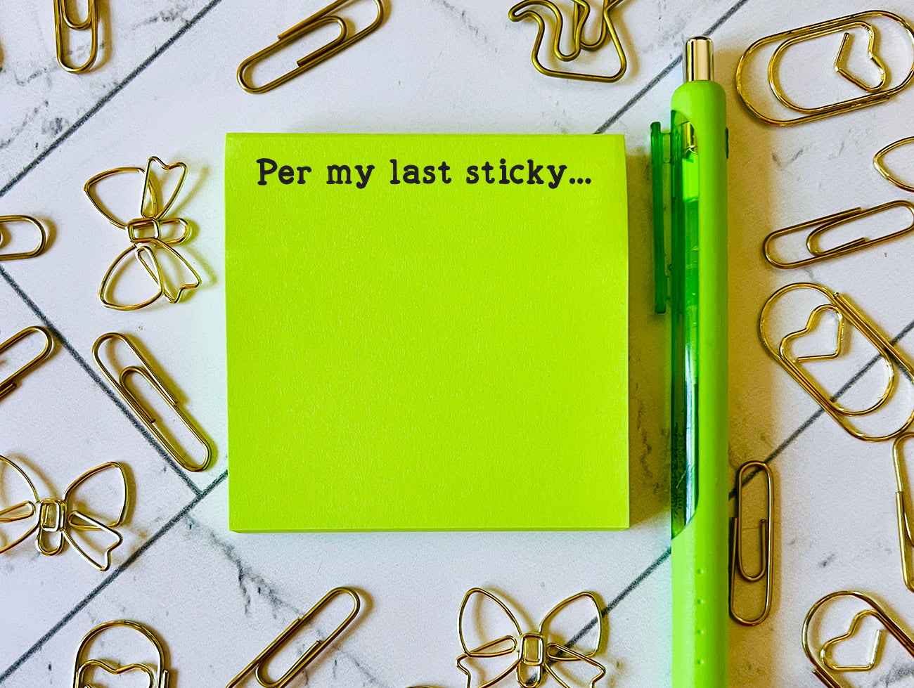 We are so excited about our new sticky notes! Each pad comes with 100 3" x 3" sheets of neon paper and are printed with some of the funniest sayings around!
