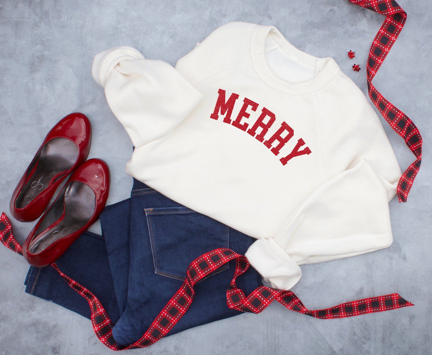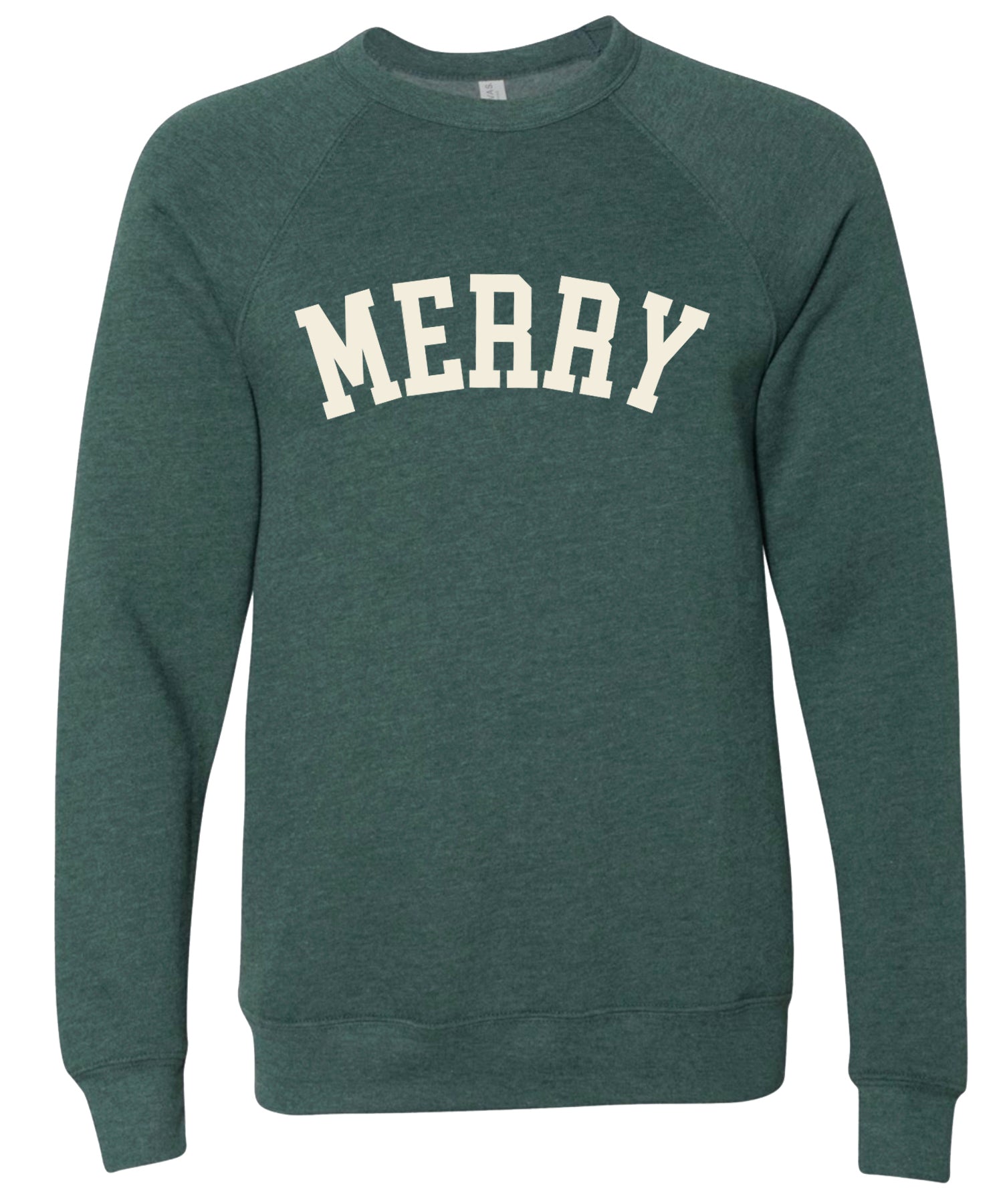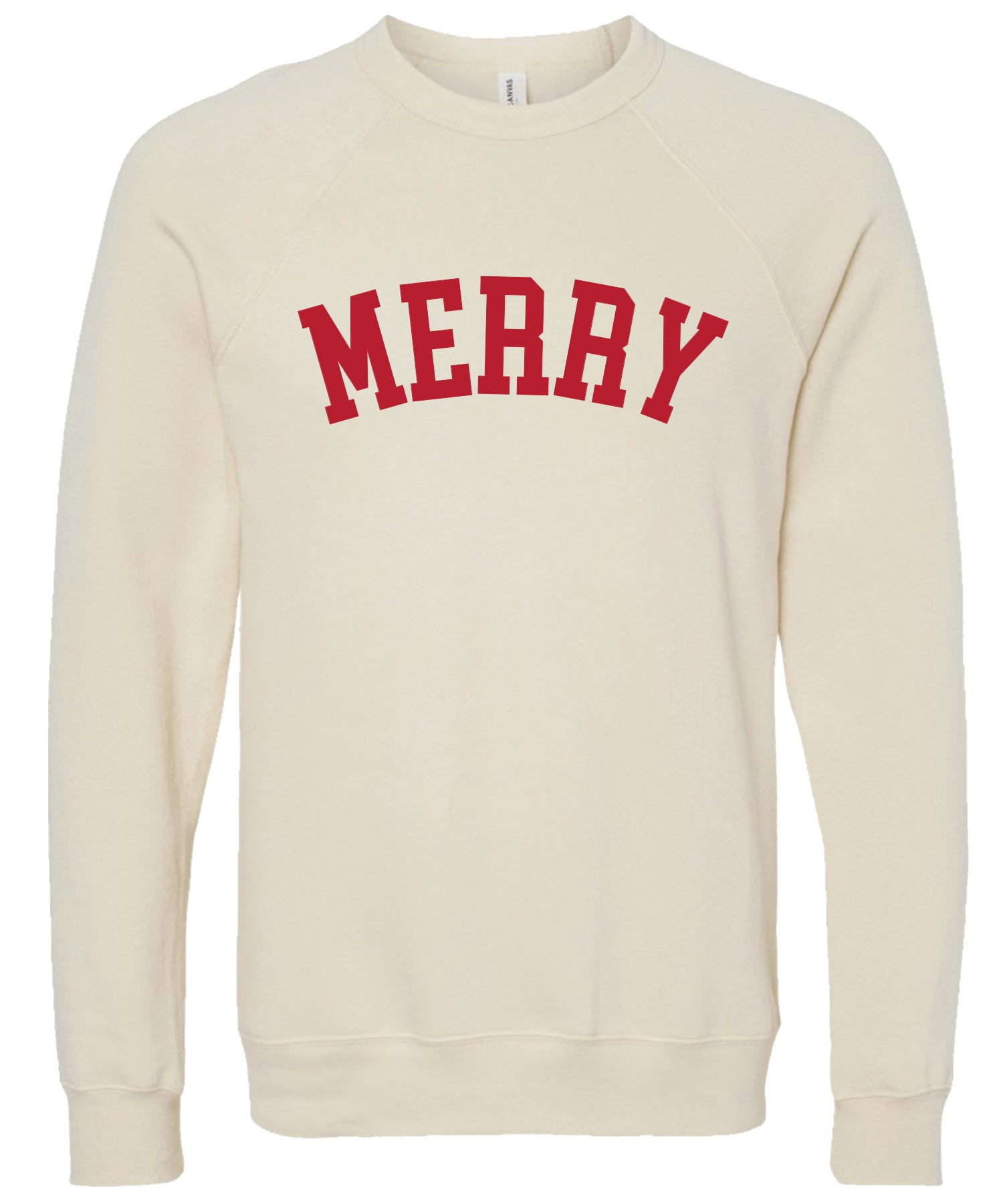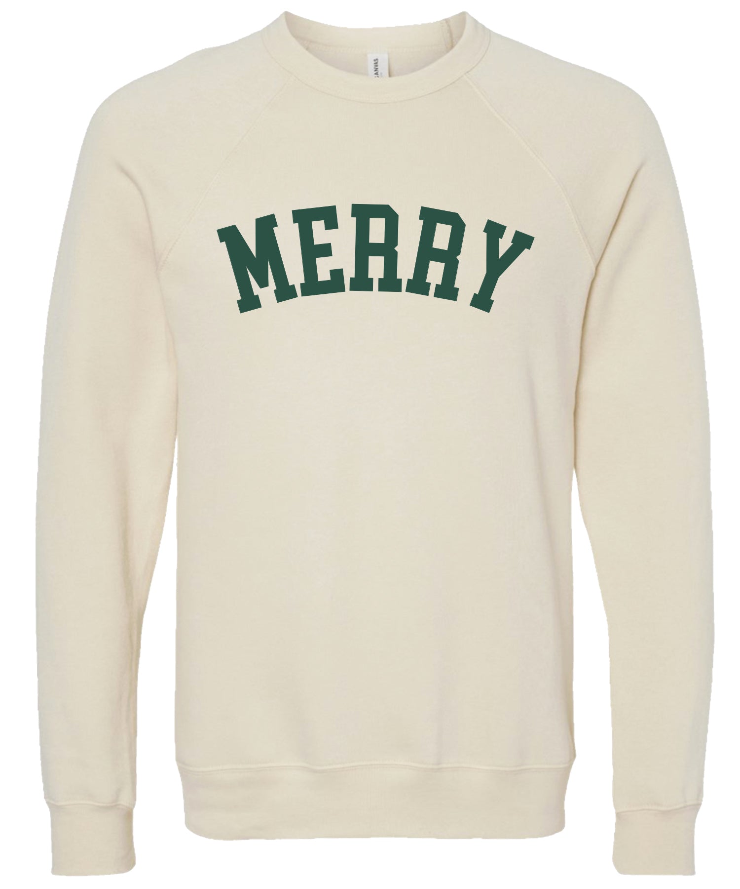The bright red and forest green sweatshirts are printed with cream ink. The cream sweatshirt is available with red or green ink.