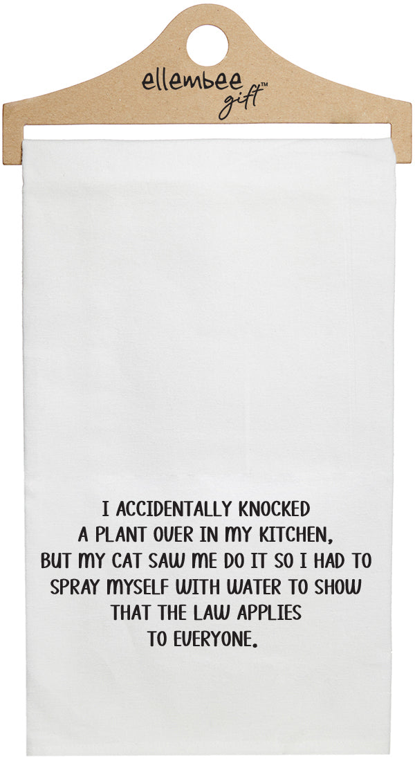 White I accidentally knocked over a plant in my kitchen, but my cat saw me do it so I had to spray myself with water to show that the law applies to everyone. kitchen tea towel with hanger